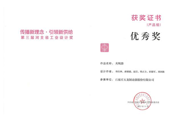 快訊:在秦皇島舉辦的第三屆河北省工業(yè)設(shè)計(jì)大賽獎(jiǎng)上石家莊五龍制動(dòng)器股份有限公司參賽的夾繩器獲本次大賽優(yōu)秀獎(jiǎng)。這是五龍公司2015年獲得優(yōu)秀獎(jiǎng)后第二次獲得此獎(jiǎng)項(xiàng)!
